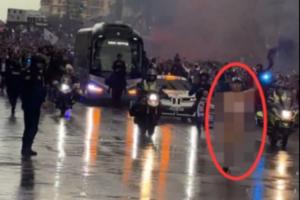 皇马大巴在球迷的簇拥中前往伯纳乌,一名裸男从大巴前跑过